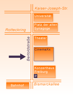 Unser Bürogebäude ist Teil des CinemaXx Kinokomplexes in der westlichen Bertoldstraße zwischen Theater und Bahnhof.